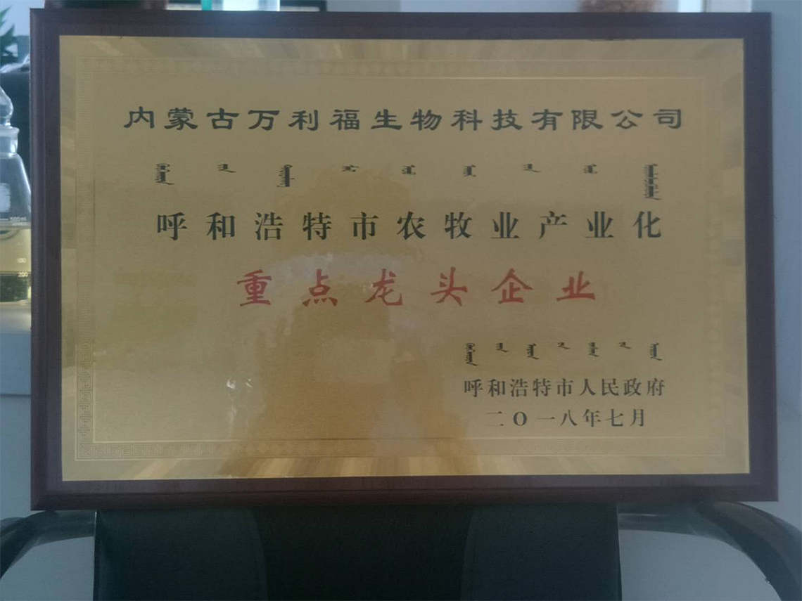2018年7月26日,呼和浩特市人民政府公布了第十二批市級(jí)農(nóng)牧業(yè)產(chǎn)業(yè)化重點(diǎn)龍頭企業(yè)通知,內(nèi)蒙古萬利福生物科技有限公司憑借在企業(yè)信用等級(jí)、企業(yè)規(guī)模、帶動(dòng)城鄉(xiāng)發(fā)展、產(chǎn)品競(jìng)爭(zhēng)力、可持續(xù)發(fā)展能力等領(lǐng)域的成就榮獲第十二批市級(jí)農(nóng)牧業(yè)產(chǎn)業(yè)化重點(diǎn)龍頭企業(yè)的殊榮。