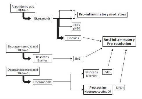 24.Serhan, C.N., et al., Resolvins: a family of bioactive products of omega-3 fatty acid transformation circuits initiated by aspirin treatment that counter proinflammation signals. J Exp Med, 2002. 196(8): p. 1025-37.