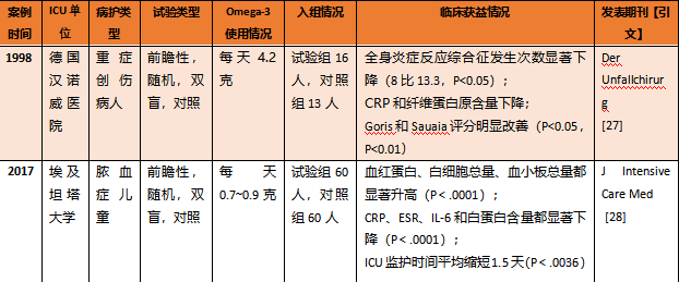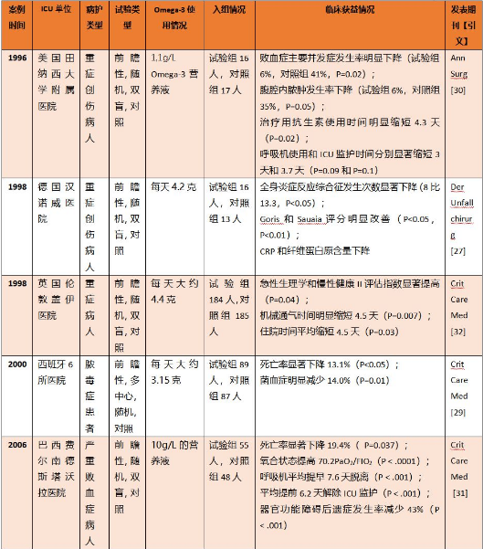 表2. 創(chuàng)傷患者和敗血癥患者使用Omega-3 PUFA的臨床獲益