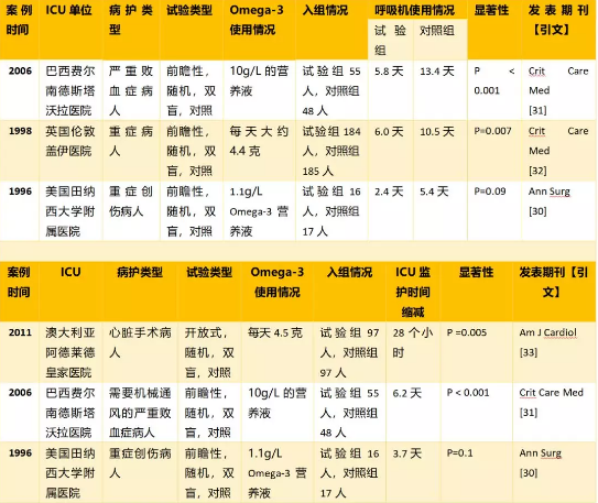表1. ICU患者使用Omega-3 PUFA帶來的生理指標(biāo)和臨床指標(biāo)獲益